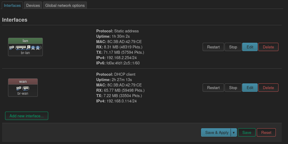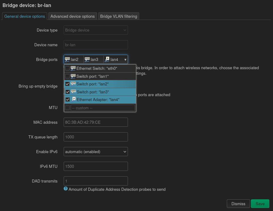 Depuis le menu Network > Interfaces, onglet Devices nous modifions la configuration du bridge lan nommé br-lan :