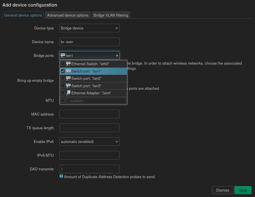 Puis nous ajoutons une nouvelle configuration de type bridge que nous nommerons br-wan :