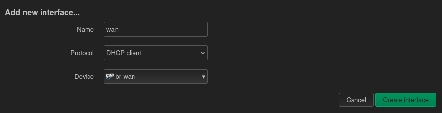 Nous retournons à l'onglet Interfaces et nous ajoutons une nouvelle interface que nous nommons wan, avec le protocole DHCP Client pour le device nouvellement créé br-wan :