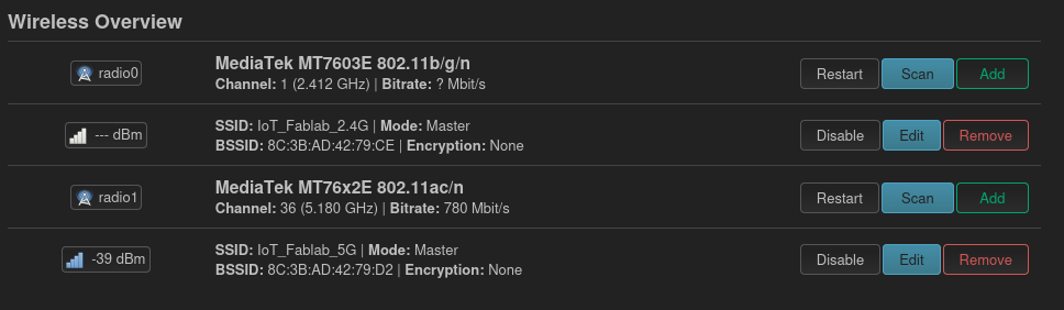 Depuis le menu Network > Wireless nous pouvons modifier puis activer nos deux points d'accès (mode N et mode AC pour les deux bandes de fréquence 2.4GHz et 5GHz) :